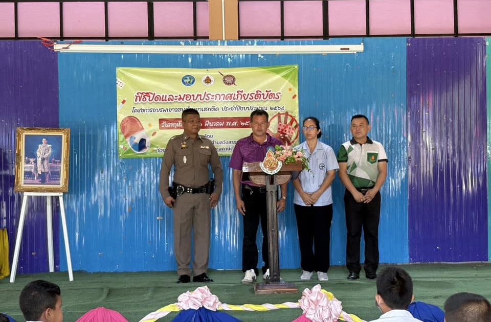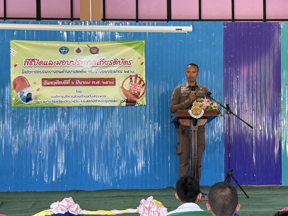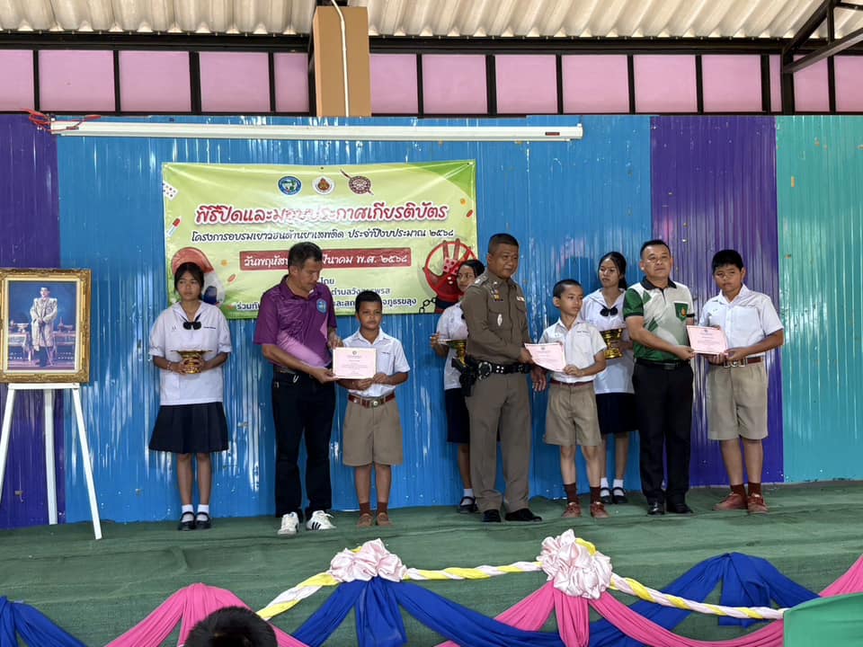 ปิดโครงการ D.A.R.E. 6 มีนาคม 2025 โดย khlung / งานจราจร,งานจราจร มี.ค.68,งานป้องกันปราบปราม,งานป้องกันปราบปราม มี.ค.68 วันนี้ 6 มีนาคม 2568 เวลา 08.30น.-09.30 น.ภายใต้การอำนวยการของพ.ต.อ.ไตรสิทธิ์ โภคธรรมธนาชัย ผกก.สภ.ขลุงมอบหมายให้พ.ต.ต.นพพร กัลยา สวป.สภ.ขลุงส.ต.ท.อโนชา จองทองหลาง ผบ.หมู่(ป.)สภ.ขลุงร่วมพิธีปิดโครงการการศึกษาเพื่อต่อต้านยาเสพติดในเด็กนักเรียน(D.A.R.E.)และมอบใบประกาศ แก่นักเรียนชั้นประถมศึกษาปีที่5 โรงเรียนวัดเวฬุวัน ต.วังสรรพรส อ.ขลุง จ.จันทบุรี