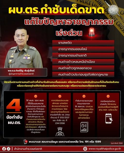ผบ.ตร. กำชับ ตามที่ รัฐบาล และ ตร. มีนโยบายเร่งด่วนในการแก้ไขปัญหายาเสพติด ปัญหาอาชญากรรมออนไลน์ อาชญากรรมข้ามชาติ คนต่างด้าวหลบหนีเข้าเมืองโดยผิดกฎหมาย และคนต่างด้าวถูกหลอกลวงหรือประกอบธุรกิจผิดกฎหมายซึ่ง ตร. ได้มีมาตรการให้หน่วยปฏิบัติตามนัยหนังสือ ตร. ด่วนที่สุด ที่ ๐๐๐๗.๓๓/๓๑๖ ลง ๒๓ ม.ค.๖๘ ตลอดจนการป้องกันปราบปรามคนต่างด้าวที่เข้ามาในลักษณะ ที่แอบแฝงหรือกระทำความผิดในลักษณะที่เป็นภัยต่อสังคม หรือจะก่อเหตุร้ายให้เกิดอันตรายต่อความสงบสุขหรือความปลอดภัยของประชาชน หรือความมั่นคงแห่งราชอาณาจักร อันส่งผลต่อภาพลักษณ์หรือประสิทธิภาพในการบังคับใช้กฎหมายของสังคมโดยรวม จึงกำชับให้ทุกหน่วยดำเนินการ ดังนี้