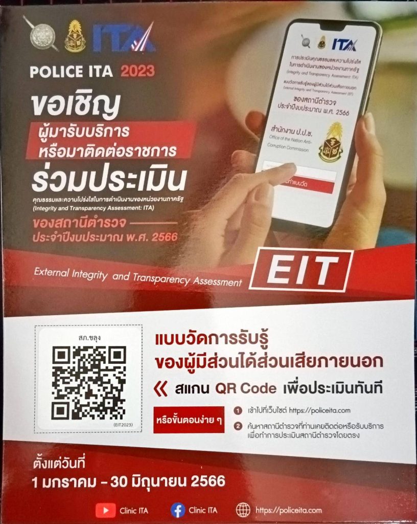 ขอเชิญผู้มารับบริการหรือมาติดต่อราชการร่วมประเมินคุณธรรมและ ความโปร่งใสในการดำเนินงานของหน่วยงานภาครัฐ (Integrity and Transparency Assessment: ITA) ของสถานีตำรวจภูธรขลุง ประจำปีงบประมาณ พ.ศ. 2566