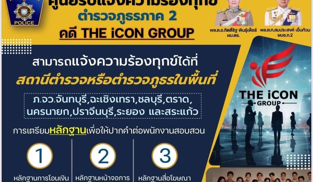 ศูนย์รับแจ้งความร้องทุกข์ The icon group 20 ตุลาคม 2024 โดย khlung / ข่าวประชาสัมพันธ์,งานสอบสวน,งานสอบสวน ต.ค.67 หากท่านใดได้รับความเสียหายจากคดีThe icon groupสามารถแจ้งความร้องทุกข์ได้ที่“สถานีตำรวจในทุกพื้นที่ของตำรวจภูธรภาค 2”เตรียมหลักฐานการโอนเงินหลักฐานหน้าจอสนทนาสื่อโฆษณาที่ทำให้ท่านหลงเชื่อ