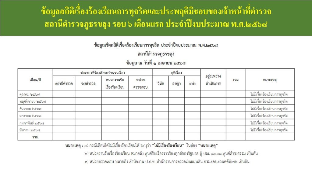 ข้อมูลสถิติเรื่องร้องเรียนการทุจริตและประพฤติมิชอบของเจ้าหน้าที่ตำรวจสถานีตำรวจภูธรขลุง• มีข้อมูลความก้าวหน้าการจัดการเรื่องร้องเรียน • เป็นข้อมูลในระยะเวลา 6 เดือนแรกของปีงบประมาณ พ.ศ.2568 (ตุลาคม 2567 – มีนาคม 2568)